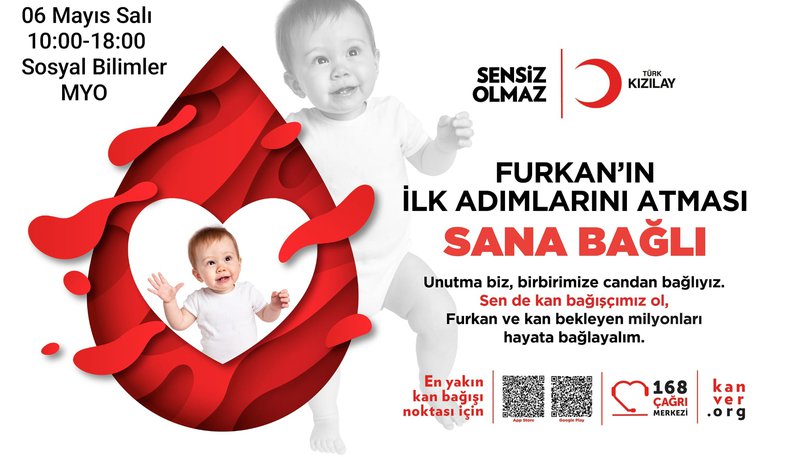 02.05.2007 tarihli ve 26510 sayılı Resmi gazetede 5624 kanun numarası ile yayınlanan Kan ve Kan Ürünleri Kanunu doğrultusunda Türkiye de ihtiyacı olanlara kan temin etme görevi öncelikli olarak Kızılay Kan Merkezlerine verilmiştir. Bilindiği üzere kan; kaynağı sadece insan olan , yapay olarak üretilmeyen bir tedavi aracıdır. Bu nedenle Türk Kızılay Gümüşhane Kan Bağışı Merkezi olarak hastalarımızın ihtiyacı olan kan ve kan ürünlerini temin etmek amacıyla 06.05.2025 tarihli 10:00-18:00 saatleri arasında Sosyal Bilimler MYO önünde kan bağışı organizasyonu gerçekleştirilecektir. Tüm akademik, idari personelimizin ve öğrencilerimizin kan bağış organizasyonuna destekleri beklenmektedir.