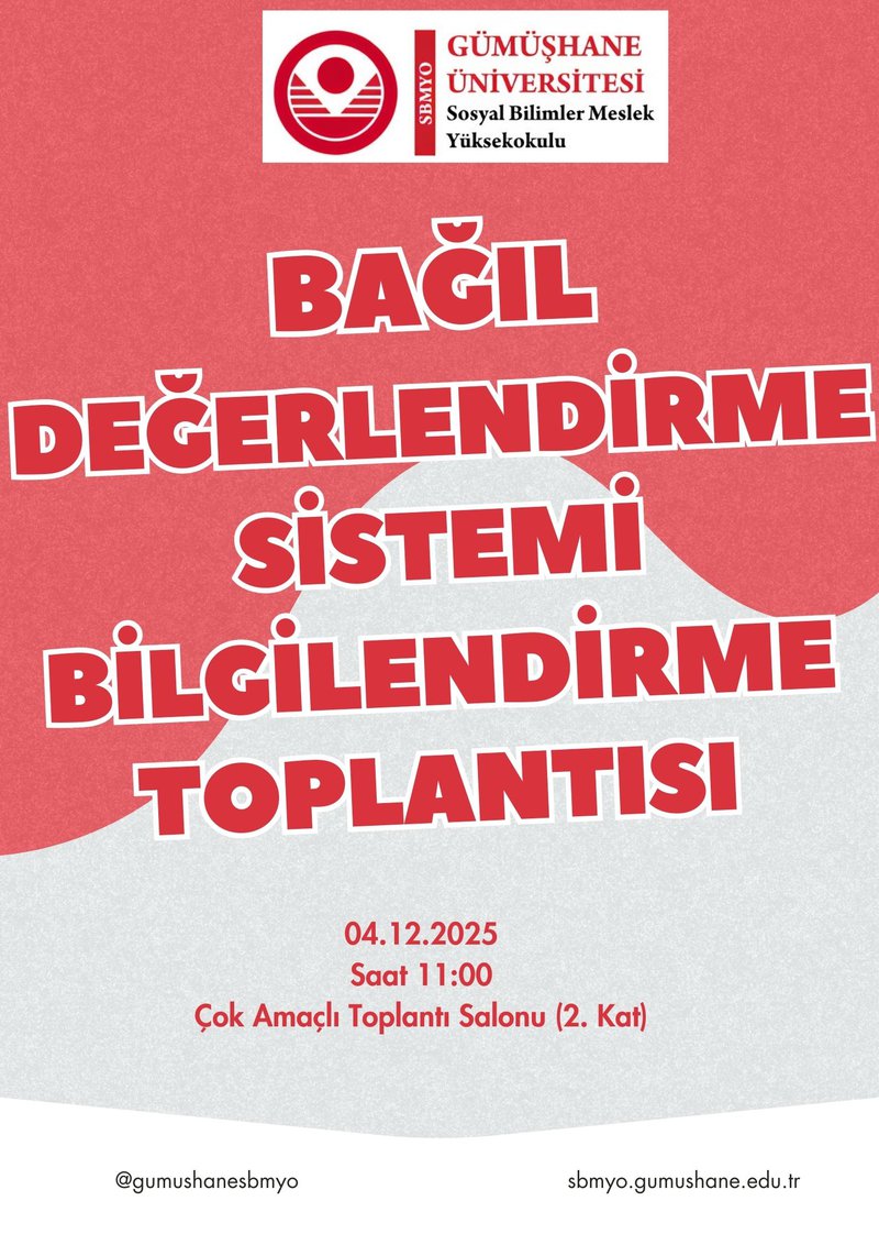 4 Aralık Perşembe günü bağıl değerlendirme sistemi bilgilendirme toplantısı yapılacaktır. Tüm öğrencilerimiz ve akademik personelimiz davetlidir. Bilgilendirme Öğrenci İşleri Daire Başkanlığı tarafından yapılacaktır.
