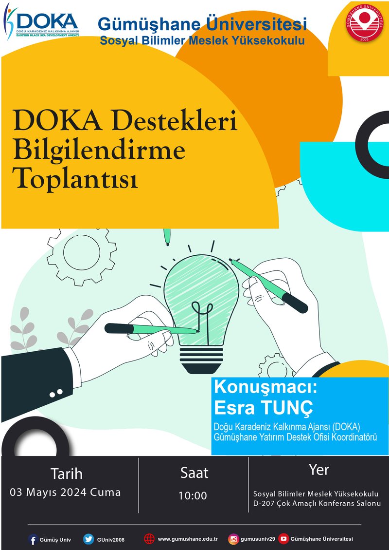Doğu Karadeniz Kalkınma Ajansı (DOKA) Gümüşhane Yatırım Destek Ofisi Koordinatörü Esra Tunç tarafından 03 Mayıs Cuma günü saat 10:00'da, Sosyal Bilimler Meslek Yüksekokulu D-207 Çok Amaçlı Konferans Salonunda DOKA desteklerine yönelik bilgilendirme toplantısı düzenlenecektir. Tüm akademik personelimizin katılımı önemle rica olunur.