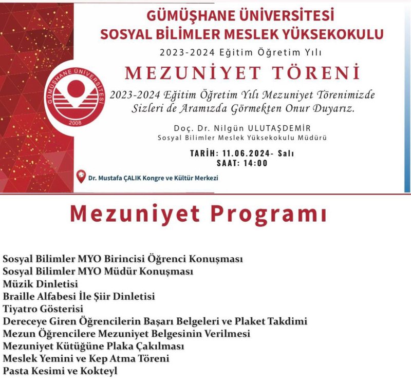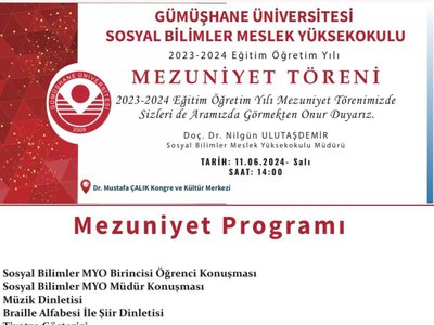Sosyal Bilimler Meslek Yüksekokulu 2023-2024 Eğitim-Öğretim Yılı Mezuniyet Programı aşağıda yer almaktadır. Tüm öğrencilerimize duyurulur.