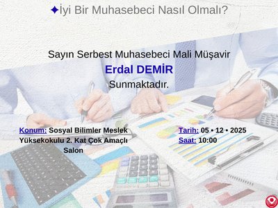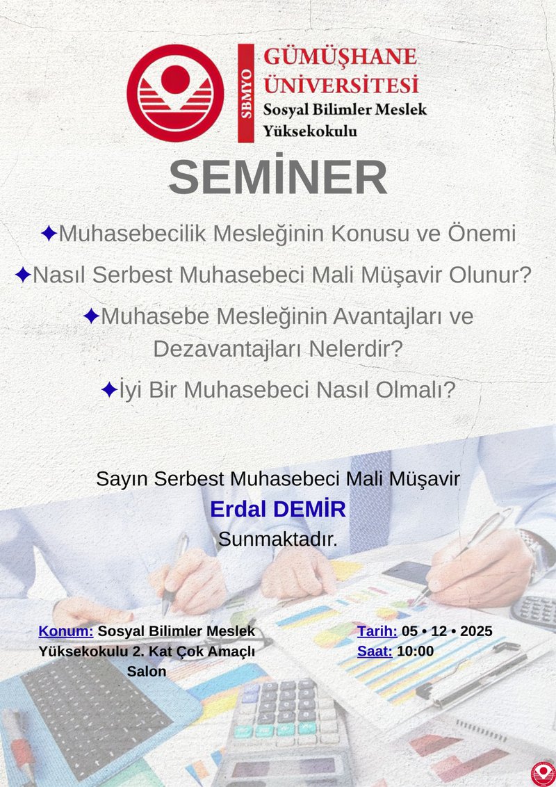 Muhasebe ve Vergi Bölümümüz Mali Müşavir Erdal Demir’i ağırlıyor. Muhasebecilik mesleğinin detaylarının tartışılacağı seminere tüm öğrencilerimiz davetlidir.
