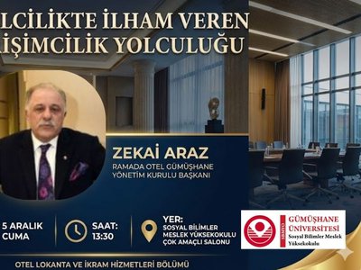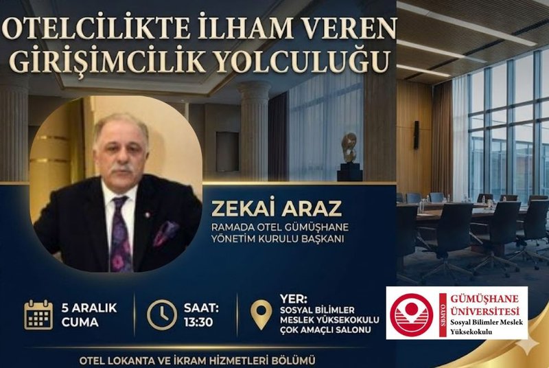 Ramada Otel Gümüşhane Yönetim Kurulu Başkanı Sayın Zekai Araz'ın konuşmacı olarak katılacağı "Otelcilikte İlham Veren Girişimcilik Yolculuğu" adlı etkinliğimizde, turizm sektörünün dinamikleri ve girişimcilik süreçleri ele alınacaktır.