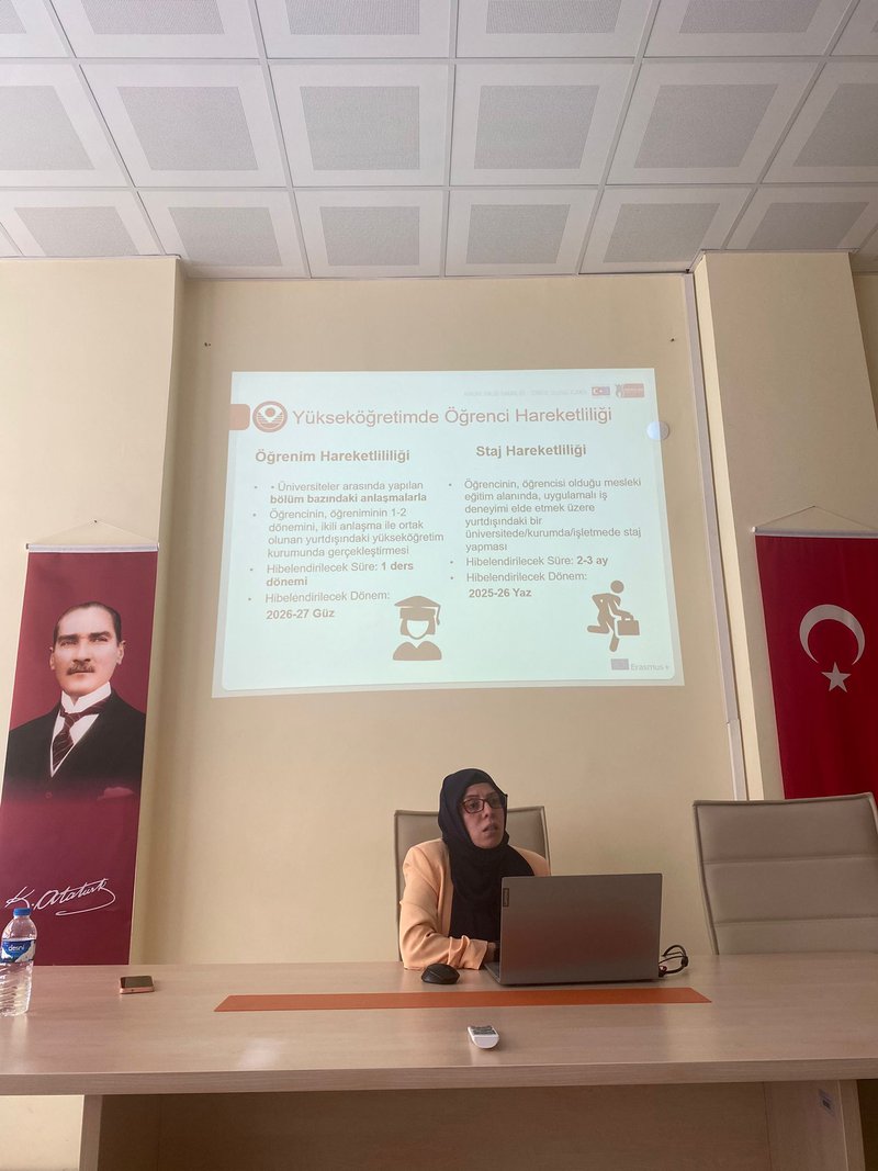 Bu çerçevede, Erasmus Kurum Koordinatörü Dr. Öğr. Üyesi Şerife ÖRS, Kurum Erasmus Program Sorumlusu Öğr. Gör. Nalan DEMİR ve Öğr. Gör. Duygu ÇINAR BALTACI, MYO Erasmus Koordinatörü ve Bölüm Erasmus Koordinatörleri, bilgilendirme etkinliğinin ardından bir araya gelerek olası iş birlikleri ve ikili anlaşmalar hakkında kapsamlı bir değerlendirme toplantısı gerçekleştirdi. Toplantıda, hem personel hem de öğrenci hareketliliklerini artırmak amacıyla Erasmus ikili anlaşmalarının genişletilmesi, yeni iş birliklerinin kurulması ve Erasmus tabanlı projelerin arttırılması konusunda mutabakata varıldı. Mevcut süreçlerin gözden geçirilmesi ve daha fazla uluslararası iş birliği fırsatının oluşturulması için stratejik planlamalar yapıldı.